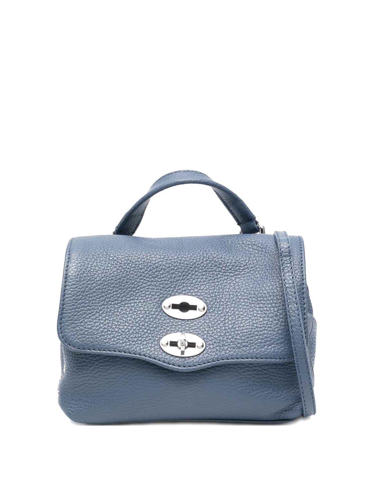 Poignée supérieure simple bleue avec détails cloutés, fermeture à rabat, fermeture par torsion, bandoulière amovible et ajustable