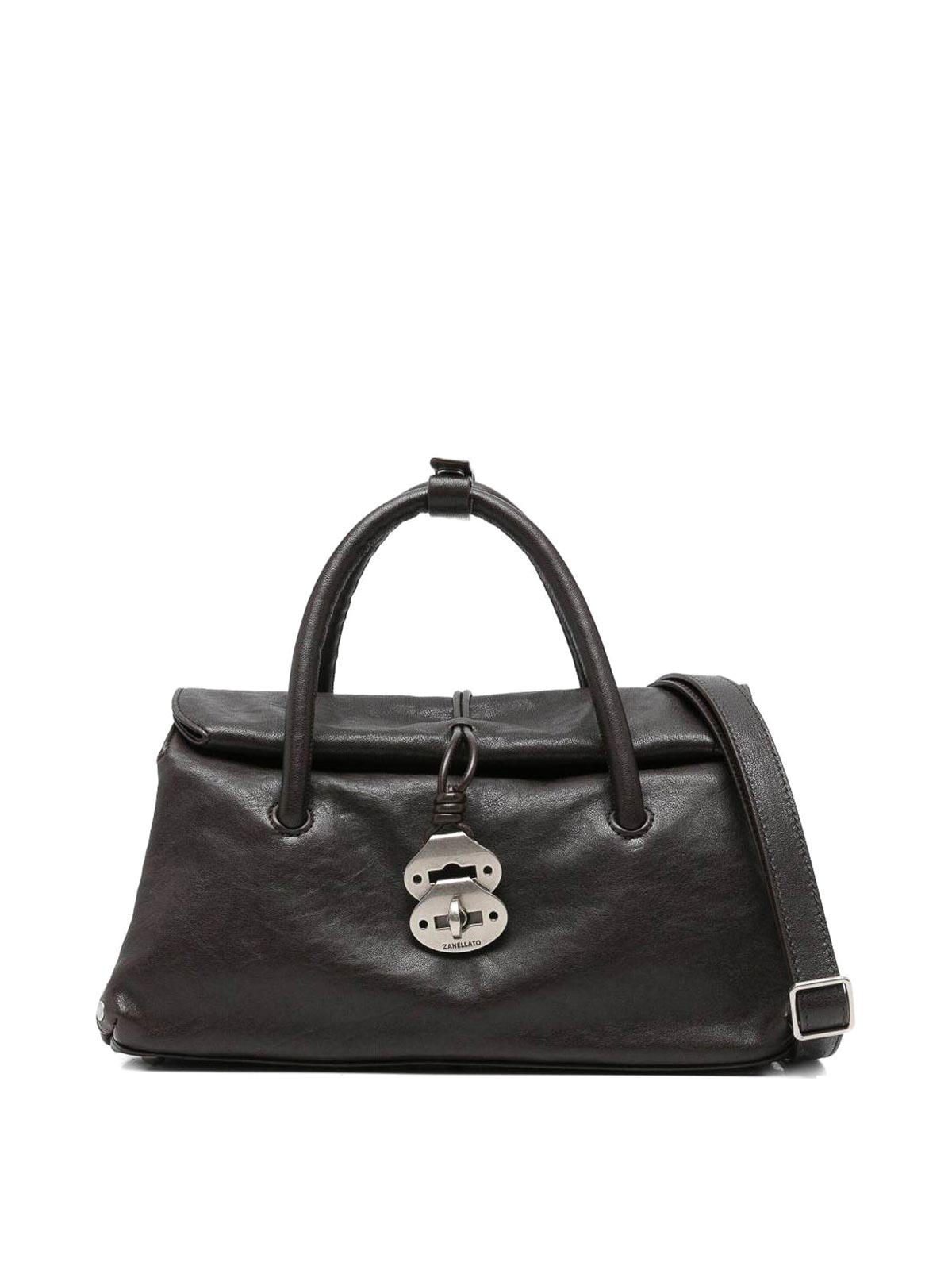 Poignées supérieures brunes, bandoulière amovible, poche zippée ornée de clous