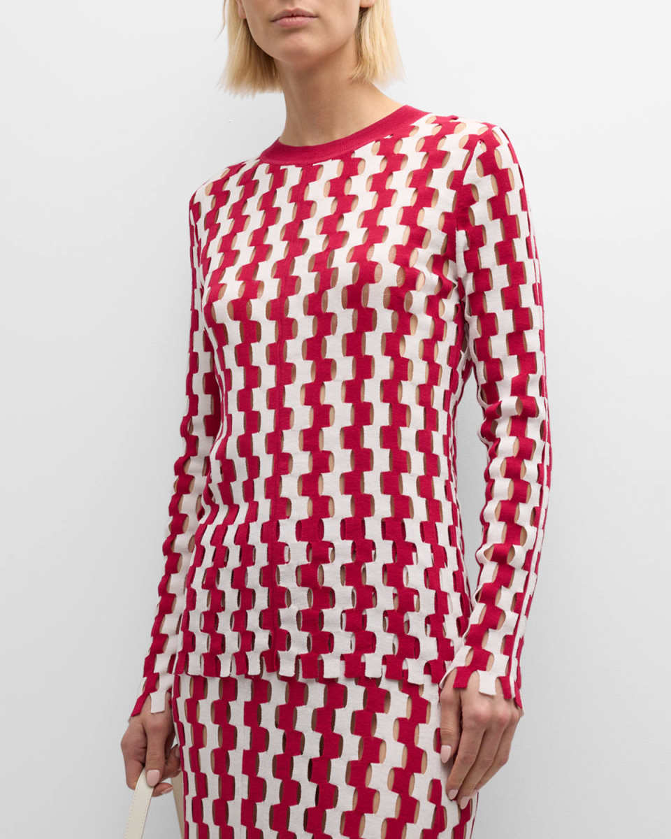 ZANKOV "Gigi" sweater featured in an intarsiaknit design with cutout detailing throughout Crew neckline Long sleeves Hip length Slim fit Pullover style Cotton/nylon/polyamide Dry clean Imported