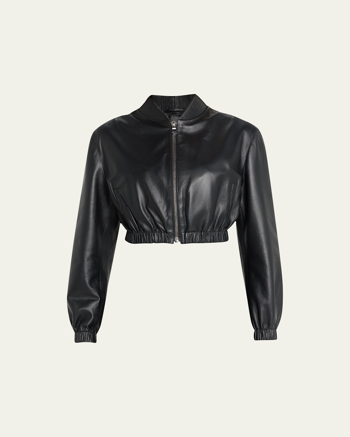 ZEYNEP ARCAY mini bomber jacket made from highquality lambskin leather Approx. 14"L from shoulder to hem Band collar; ribbed Zip front Long sleeves; approx. 24.0"L Elasticized cuffs and hem Side slip pockets Cropped at the midriff Relaxed fit Lambskin leather Dry clean Imported