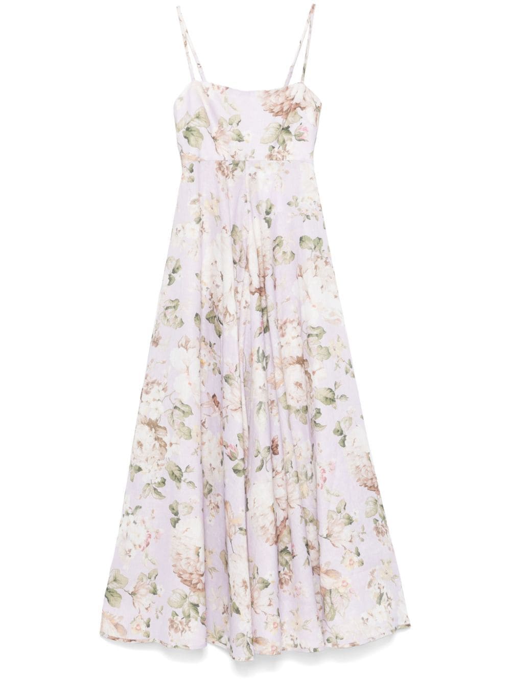 lilac purple/multicolour linen slub texture concealed rear hook and zip fastening square neck rubber grips adjustable spaghetti straps sleeveless all-over floral print shirred panel to the rear flared skirt partial lining straight hem mid-length
