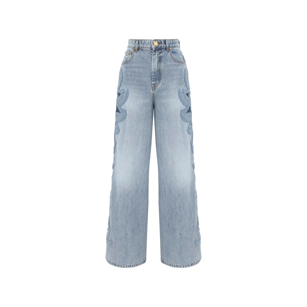 clear blue denim texture embroidered detailing cut-out detailing belt loops classic five pockets front button and zip fastening wide leg