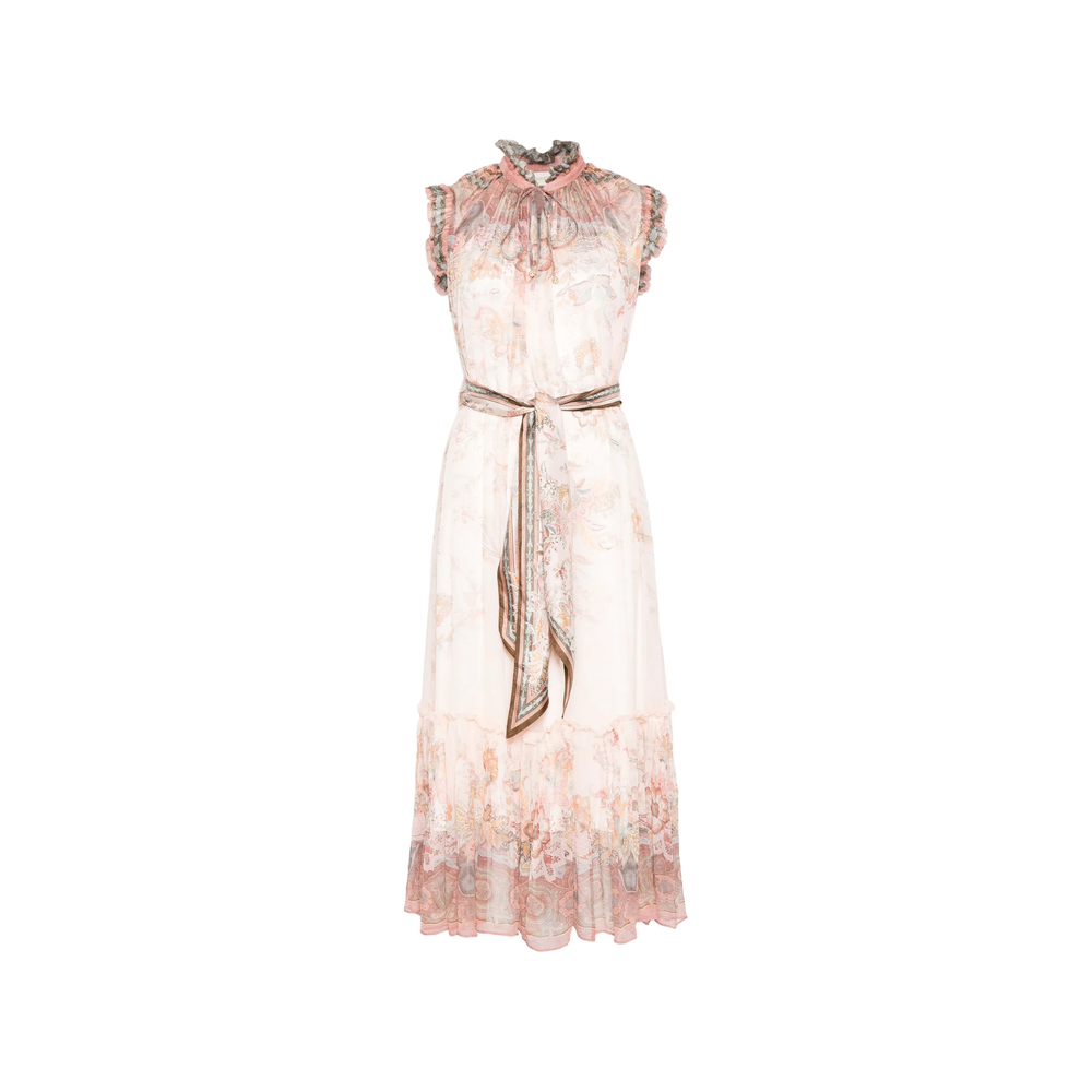 pink/multicolour paisley print ruffled detailing tie-fastening straps belted waist