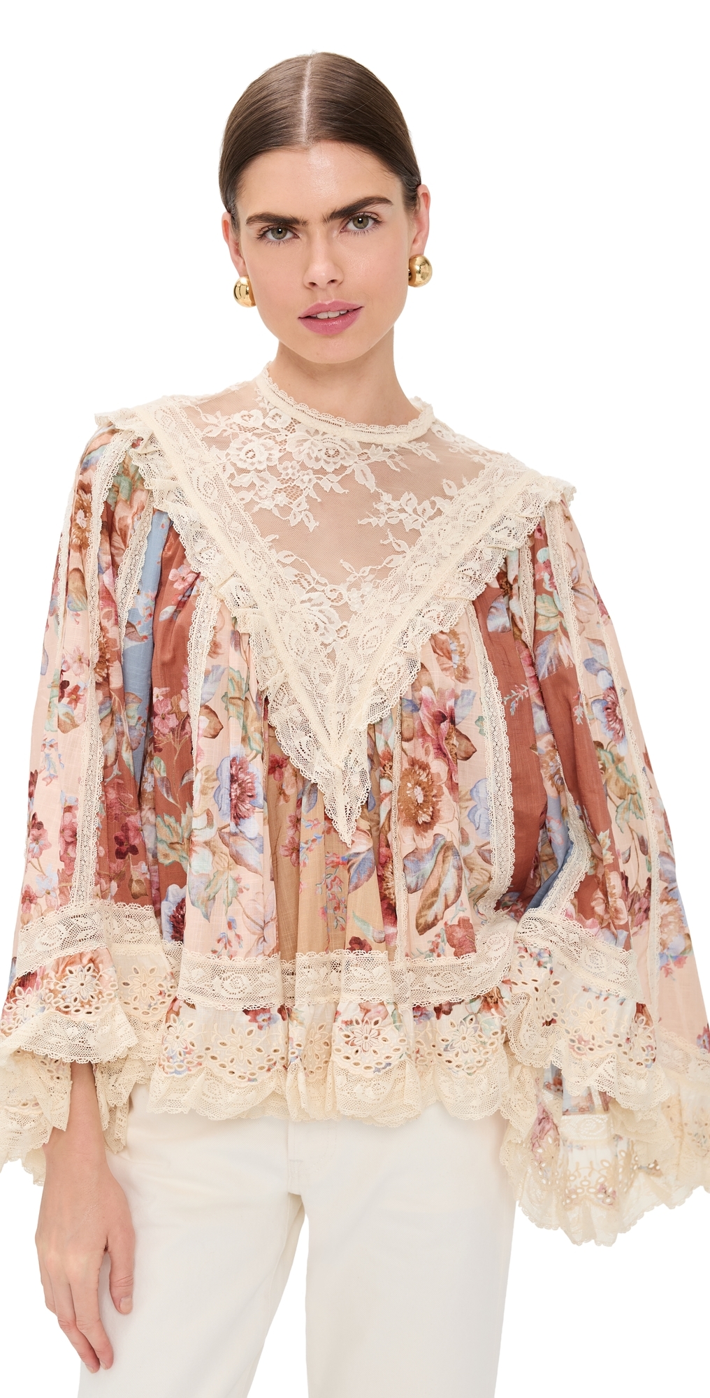 Fabric: Lightweight, non-stretch plain weave. Floral print. Allover gathering and lace trim. Sheer V paneling at bust and back. Crew neck. Long bell sleeves. Button keyhole at back. Shell: 100% cotton. Trim: 100% cotton. Dry clean. Imported, China. Measurements: Measurements from size 0 Length: 24.75in / 63.0cm, from shoulder
