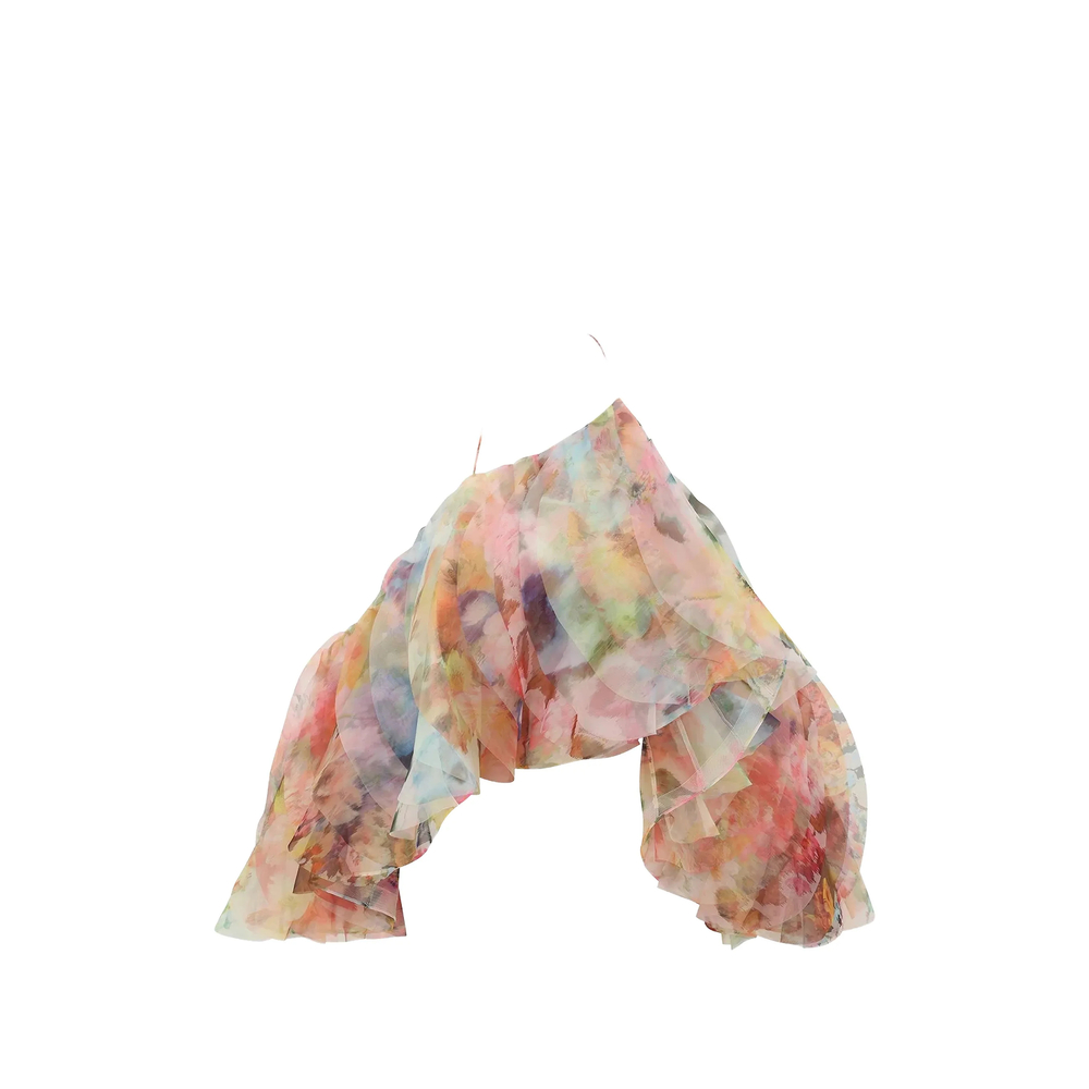 pink floral print ruffle detailing chain strap sleeveless layered design cropped