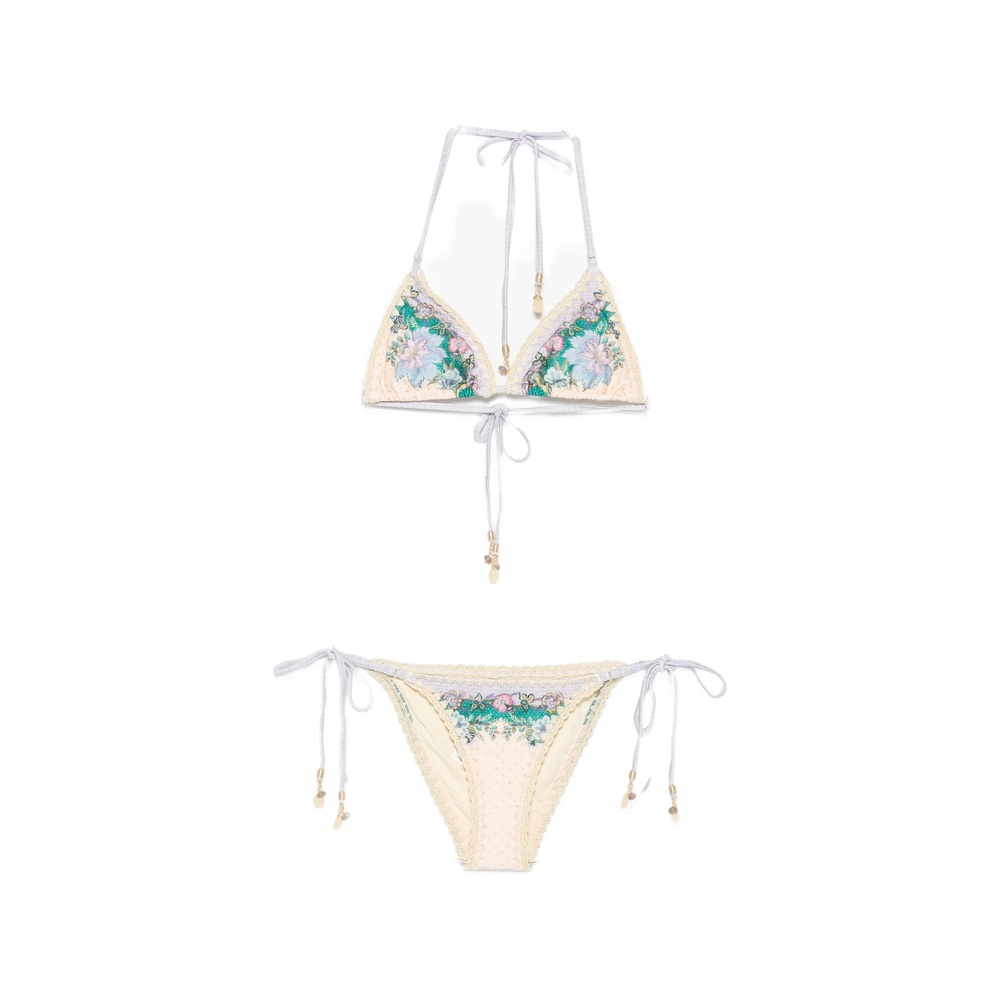 cream/multicolour floral print crochet trim triangle top halterneck tie fastening side-tie fastening charm-embellished ties Please try this on over your own garments.