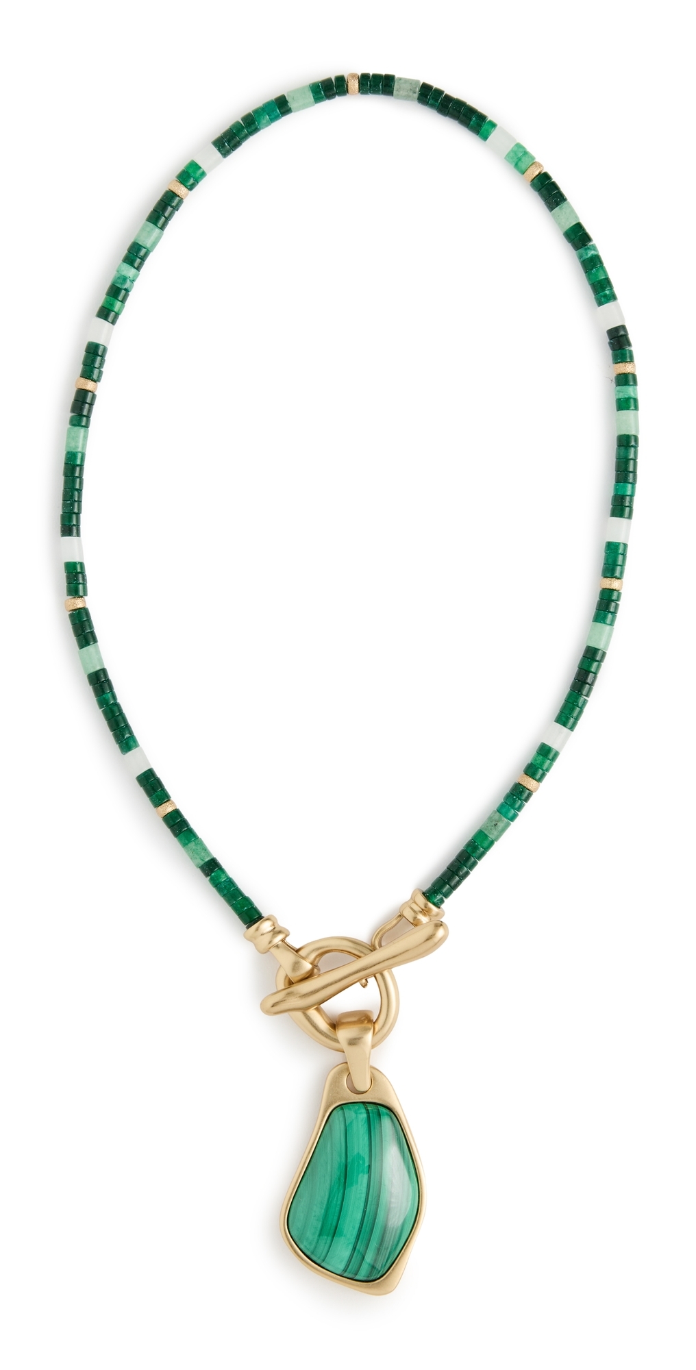 Malachite pendant. Agate and jade beads. 16k gold plated brass. T-bar clasp. Imported, China. Measurements: Length: 17.25in / 44.0cm