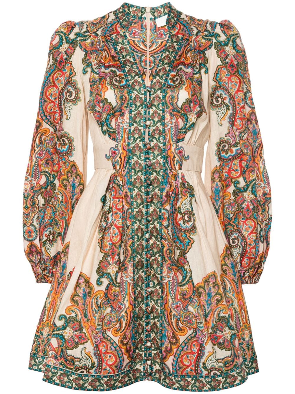 light orange/multicolour linen/flax poplin texture slub texture paisley print gathered detailing pleat detailing fabric-covered buttons band collar V-neck balloon sleeves with elasticated cuffs front button fastening flared hem partial lining This item contains at least 50% materials which are certified or widely recognised as having a lower environmental impact through production and/or manufacturing processes that reduce water consumption and the use of harmful chemicals, or re-use by-products of the production process. Learn more about what makes a product Conscious on our Conscious Criteria page