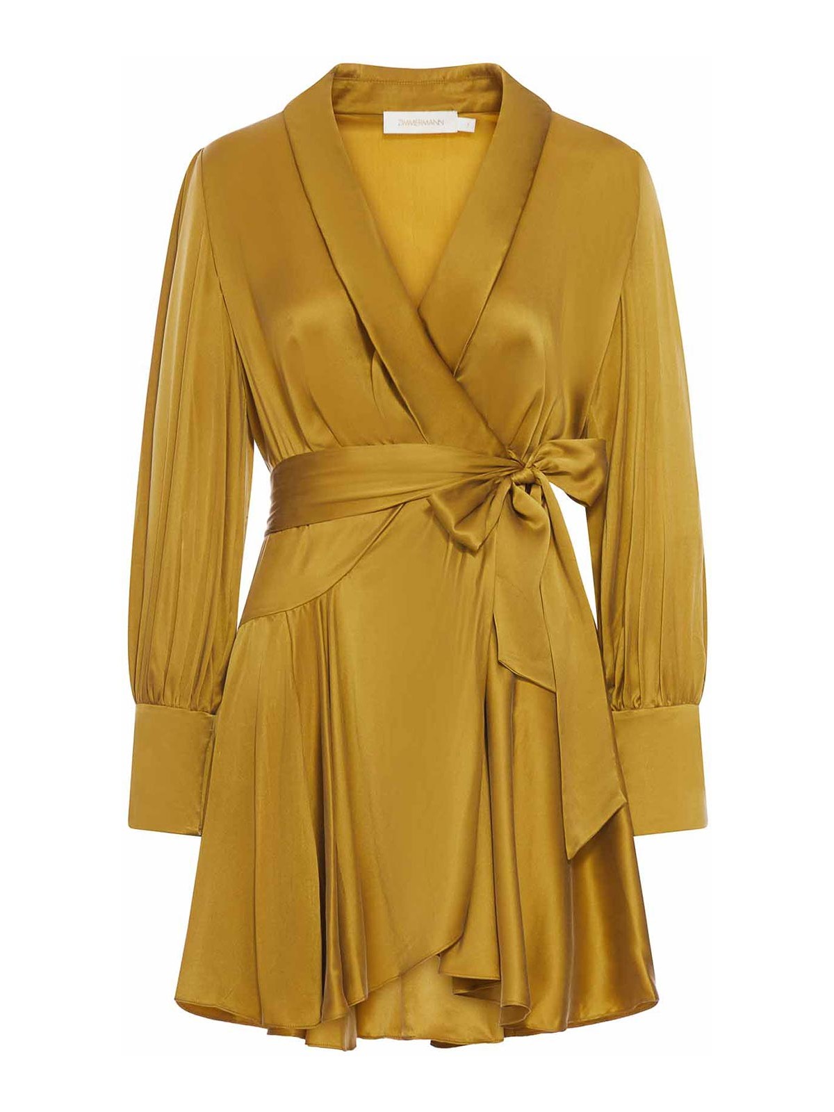 Design enveloppant, col châle, col en V, encolure, laçage avec lacets latéraux, finitions frisées, couleur olive