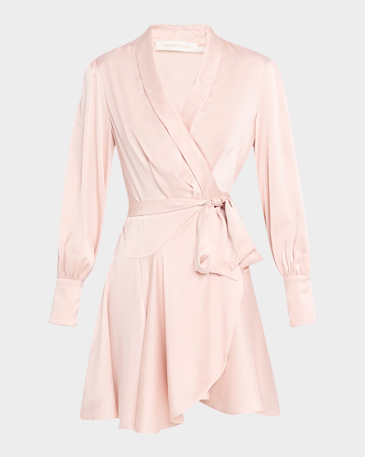 Crafted from luxurious silk, this Zimmermann mini dress features an adjustable wrap front that exudes feminine elegance. V neckline Long sleeves with button cuffs Wrap silhouette Hem falls above the knee Side tie closure Silk Dry clean only Imported