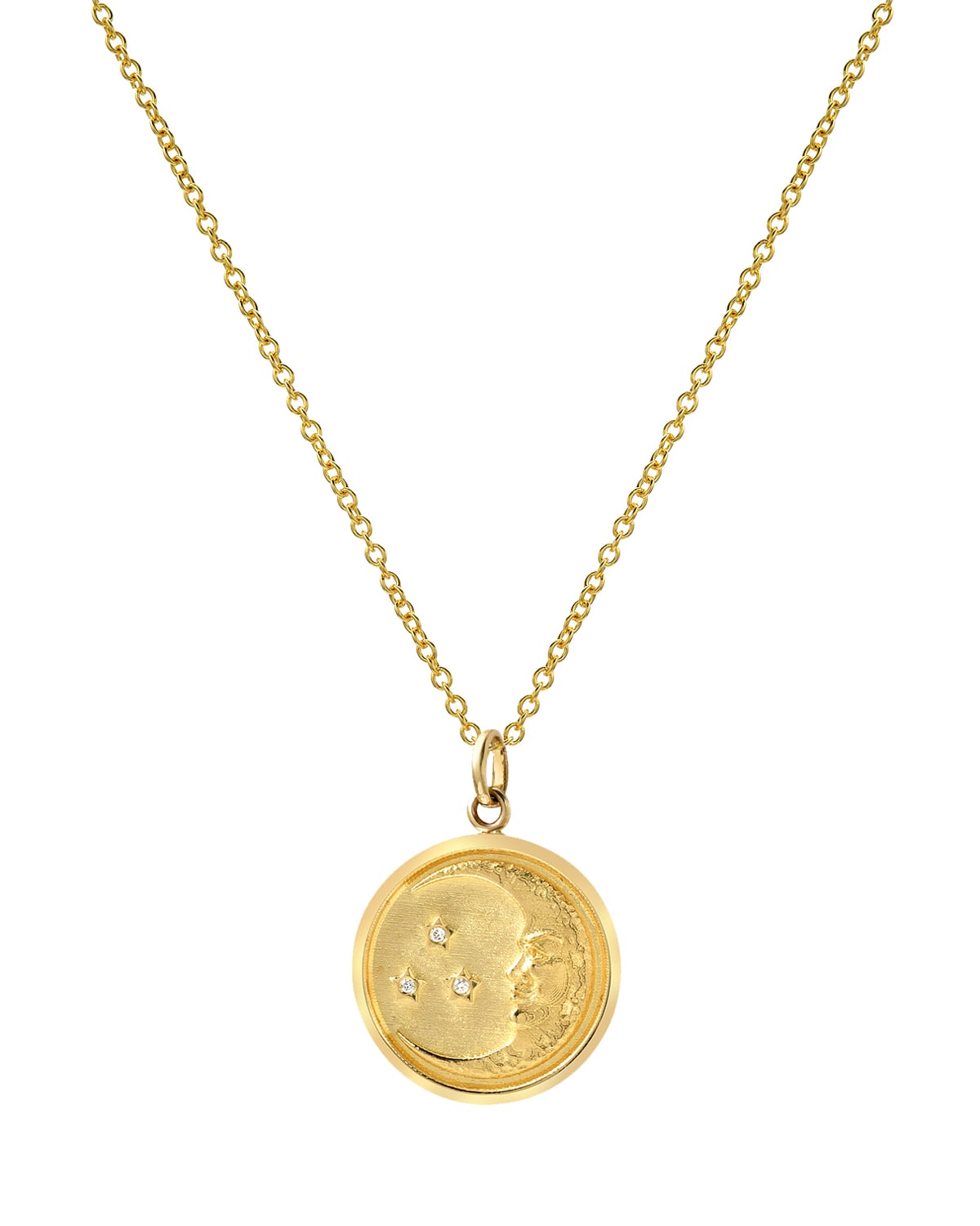 Zoe Lev Jewelry moon medallion necklace. Polished 14karat yellow gold hardware. Round medallion with crescent moon. Three round white diamonds as stars. 0.01 total diamond carat weight. Spring ring clasp. Approx. 16"L. Made in USA.