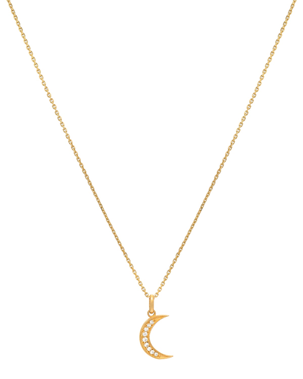 Crescent moon necklace by Zoe Lev Jewelry. Polished 14karat gold chain and hardware. Crescent moon drop with diamond pavé. 0.09 total diamond carat weight. Spring ring clasp. Approx. 16"L. Made in USA.