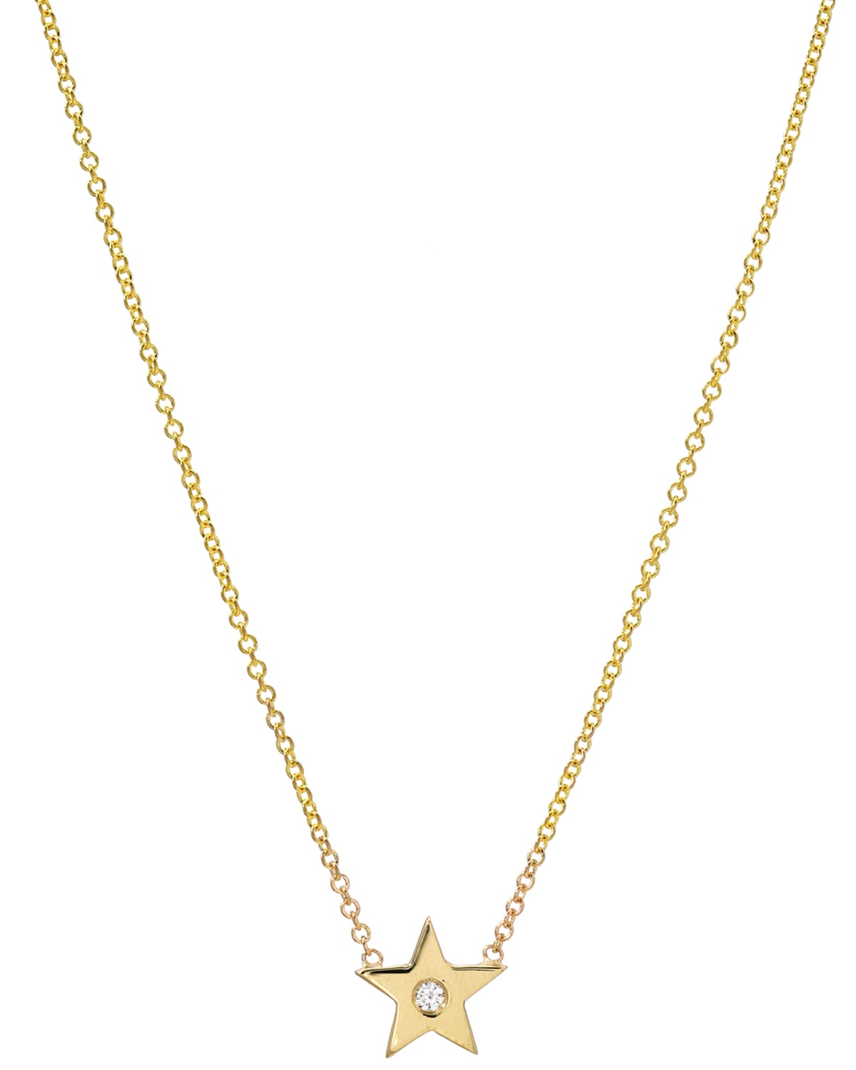 Star pendant necklace by Zoe Lev Jewelry. 14karat yellow gold chain and hardware. Integrated star with single diamond. 0.01 total diamond carat weight. Spring ring clasp. Approx. 16"L. Made in USA.