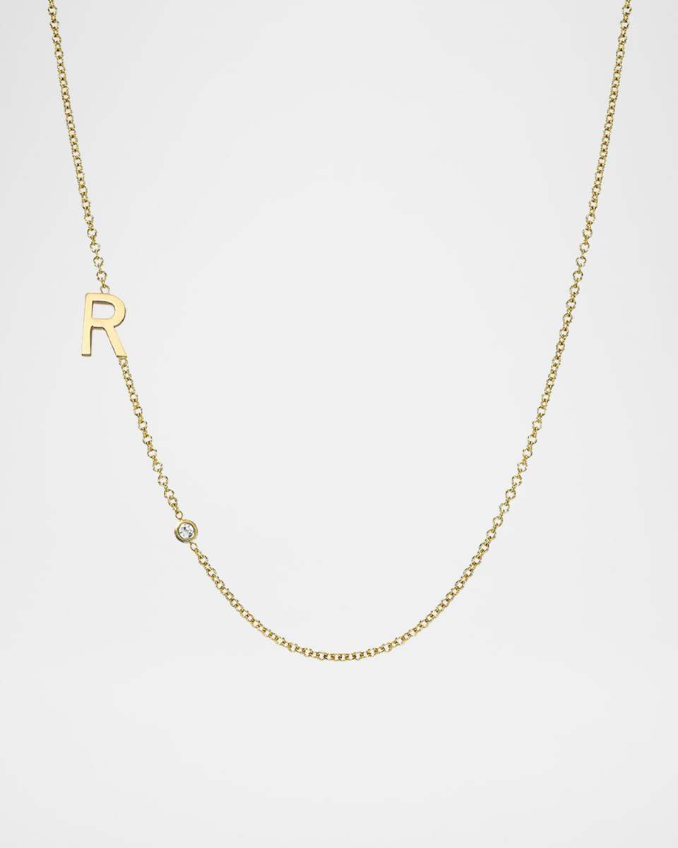 Zoe Lev Jewelry necklace with asymmetrical initial "R" and bezelset diamond 14karat yellow gold 0.03 total diamond carat weight Necklace length: approx. 1618 inches (Adjustable) Spring ring clasp Made in USA