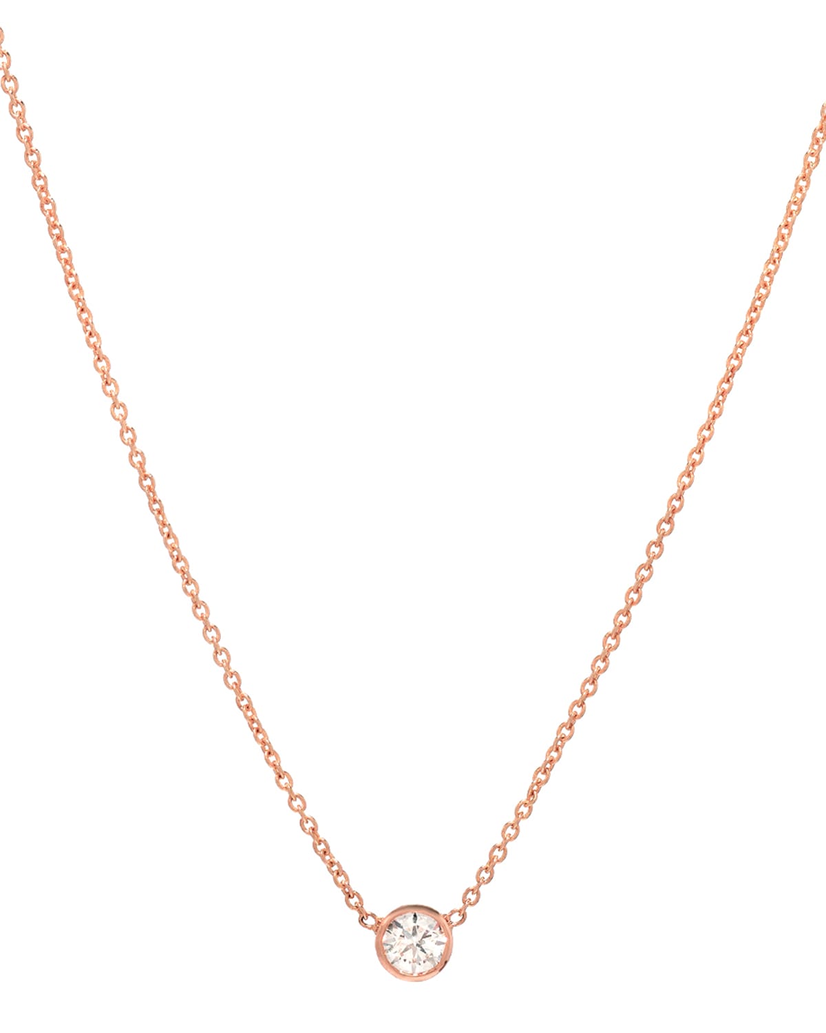 Zoe Lev Jewelry small bezel diamond necklace. 14karat gold rolo chain and bezel setting. Single integrated bezelset diamond. 0.10 total diamond carat weight. Approx. 16"L. Made in USA.